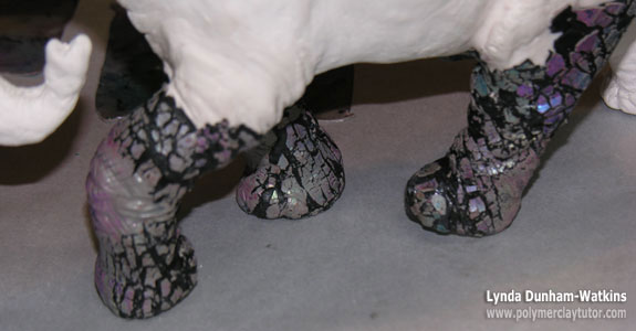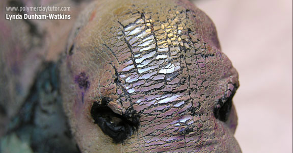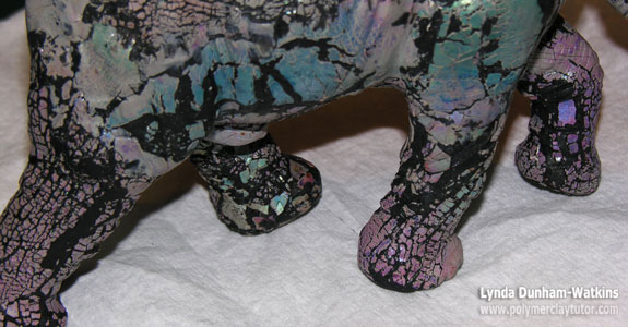 When I first thought about an elephant, the crackle paint thingy was in my mind for his skin, but then I remembered the Raku technique, and I couldn’t wait to get to the point of making his skin. I can tell you, I had more fun making this elephant than any sculpture that I’ve ever made. Some places I tore the clay, and others, I used most of an entire sheet. Early on, I had a problem with curing the clay to the proper point. I was using a heat gun. When it didn’t crackle, I rolled it thin again, backed it with the black clay and re-cured it… worked in places that I needed a subtle effect.
