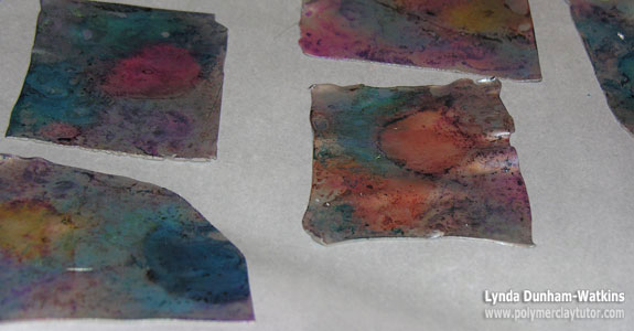 I had already made the cat and the rabbit. I used the art sheet for the cat’s underskin and then made a cane using an Amish quilt pattern for the final layer, adding copper Premo to frame the turquoise chips embedded along his back. The skin itself was so pretty… almost hated to cover it up. The rabbit was the first sculpt I made using this idea, and I love him! I’m including photos of the art sheet that I used to cover it with, and I’m not sure which colors I used, everything I had!! LOL! It doesn’t seem to matter which colors of ink you use, the result is awesome.