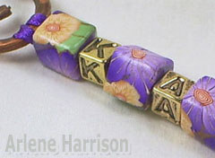 I also like her use of the cube flower beads to compliment the alphabet beads. Another bead that could be used here is the square beads shown in this post: Faux Raku Polymer Clay Tutorial
