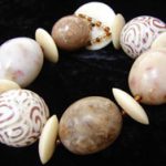 The first type of bead I’ll talk about is the flower inclusion beads (aka rose petal beads). These are the larger white stone-shaped beads with the earthy flecks of flower petals in them.