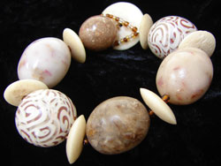 The photo above shows a beaded bracelet I made using wire, glass seed beads, shell disk beads and several large polymer clay beads done in a variety of techniques.