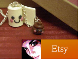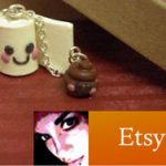 I found this very cute version of a TP and Poo polymer clay necklace on Etsy the other day. It’s handmade by Ryssa of DogEatDog Productions. Earlier this month, Ryssa and I started up a discussion about scenting polymer clay miniature food charms. Together we managed to come up with some helpful tips on adding sweet aromas to things like: chocolate earrings, cookie beads, fruit cake pendants and donut jewelry. Here’s a link to that post if you would like to more info: Scented Polymer Clay