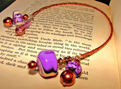 Using wire headpins, make up dangles and charms with some of your polymer clay beads. Adding a few glass beads as well can enhance the look. These can be any sized bead you like, since the dangles will hang outside the book. Make the charms interesting by varying the lengths.