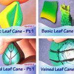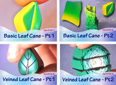 4) Veined Leaf Cane – Pt1: How to make a 3 color teardrop blend and form it into a rolled Skinner Blend Cane. In addition, cutting and layering more clay in such a way as to create veining in a more complex veined leaf cane is shown.