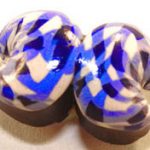 Anyways…. My DC bead design is made by starting with a small ball of polymer clay covered with slices from a polymer clay cane (a blue gingham cane in this case). The ball is formed into a football shaped bead and then sliced at both ends. Now separate and pinch the ends together to create the D and the C configuration.